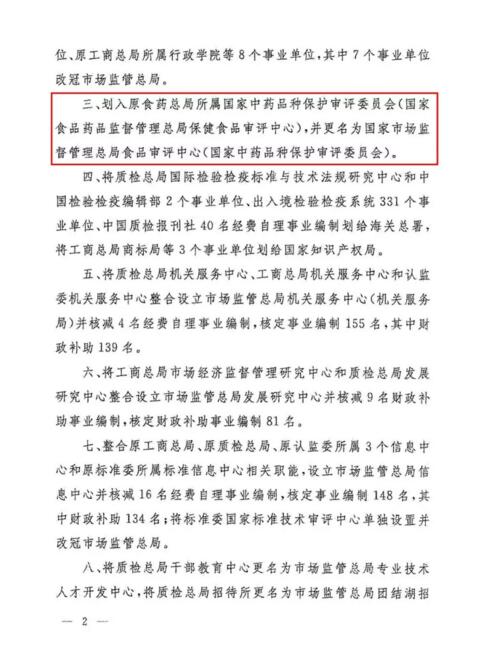 劃入原食藥總局所屬國家中藥品種保護審評委員會(國家食品藥品監(jiān)督管理總局保健食品審評中心),并更名為國家市場監(jiān)督管理總局食品審評中心(國家中藥品種保護審評委員會)。